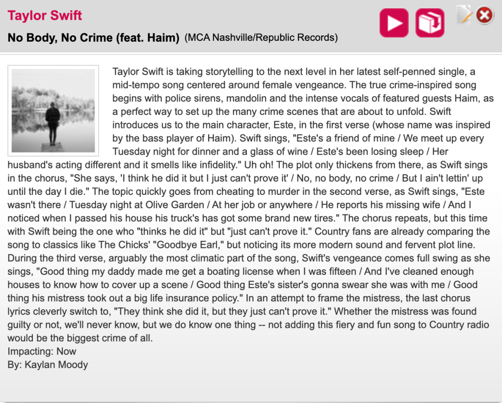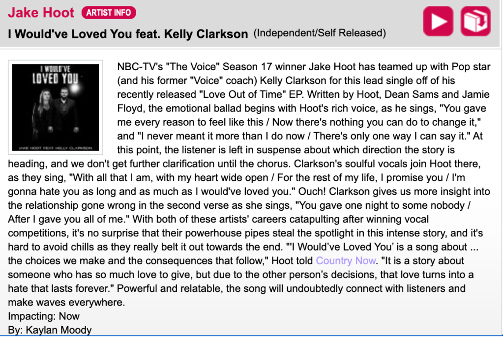 Published Writing Pieces Song Reviews Informative Industry Pieces Taylor Swift to release re-recorded version of hit song ‘love story’ tonight; announces re-recorded ‘fearless’ album is coming soon Kane Brown launches new label with sony music nashville; signs restless road singer/songwriter joy williams to host new show, ‘southern craft radio,’ on apple music country Share this: Click to share on X (Opens in new window) X Click to share on Facebook (Opens in new window) Facebook Like Loading...